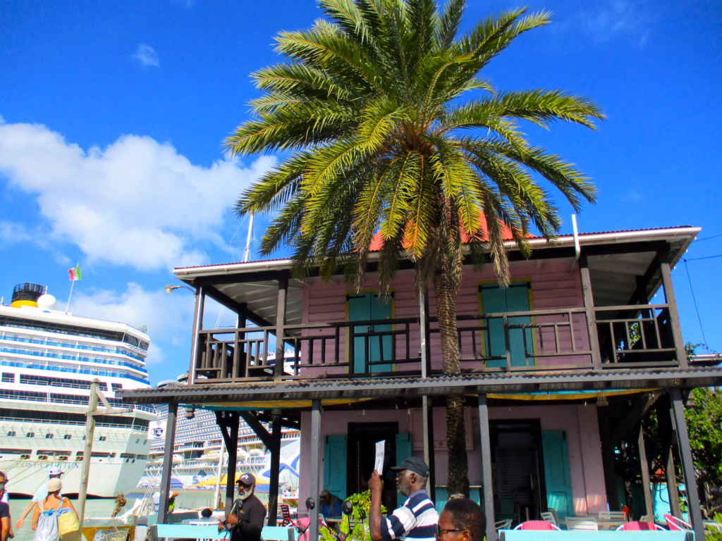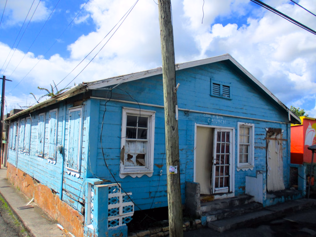 Али, идемо у лудницу града. Архитектура Кариба је, дакле, углавном дрвена, што је лепо и егзотично и опуштено, осим кад удари ураган, е онда нису тако издржљиве све те лепе куће у једној од централних улица Сент Џонса на Антигви.