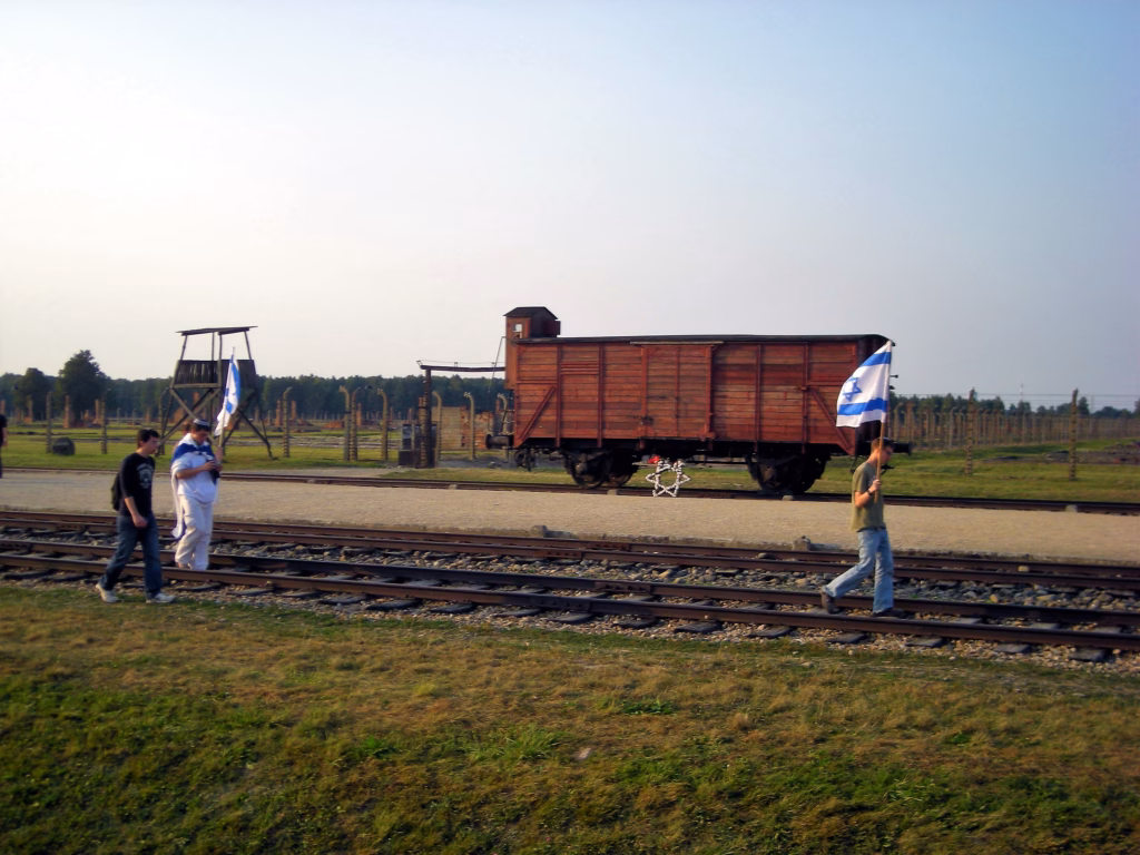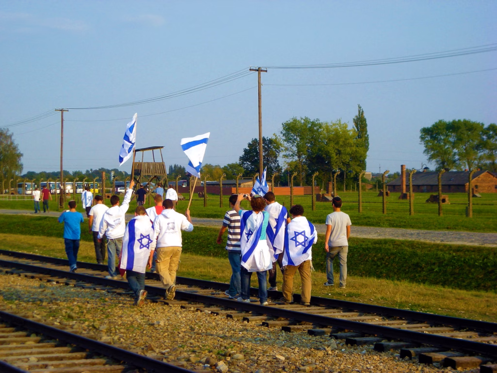 I po Birkenauu, Jevreji mašu izraelskim zastavama, pored vozova koji su odvozili njihove pretke u smrt.