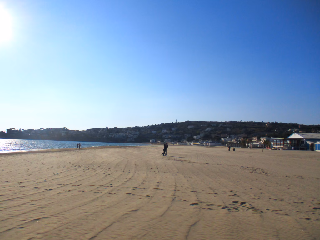 Одлазимо на шармантну плажу. Као Љорет де Мар, пуна песка, а у ували. Кафићи раде. Теоретски, могло би се и окупати, али да је иста температура и новембар. У марту се толико расхлади вода да је до колена максимум који си здраворазумски човек може приуштити. Плажа је 2025. године по 12. пут заредом добила плаву заставу за квалитет – па то све говори о њој.