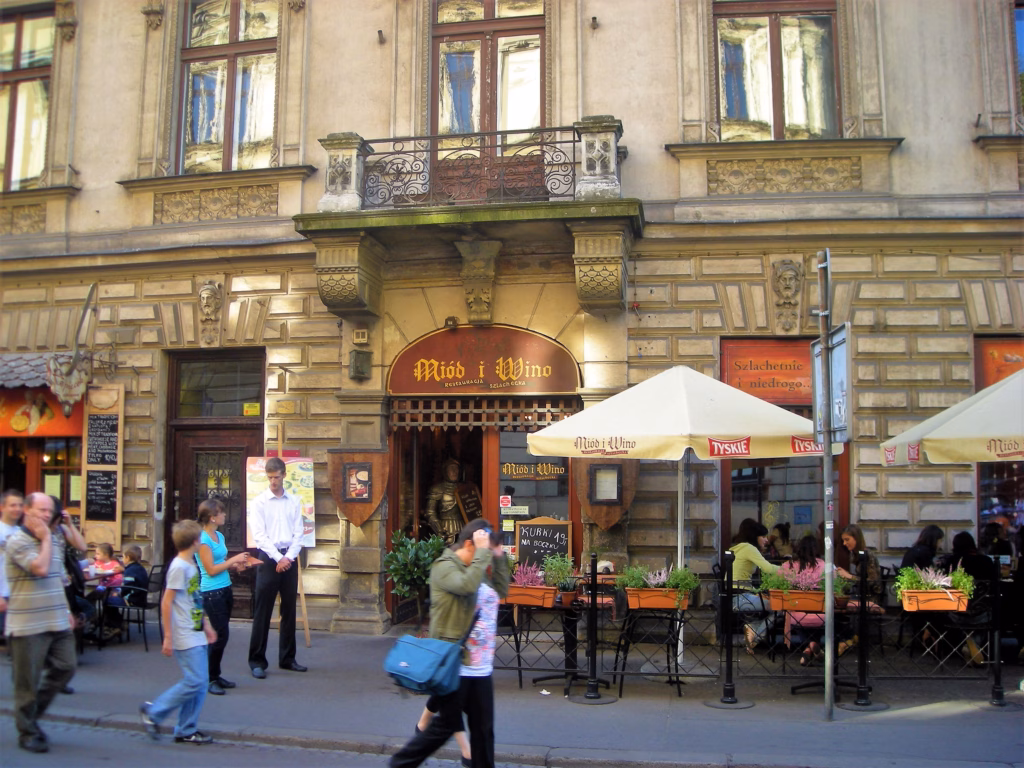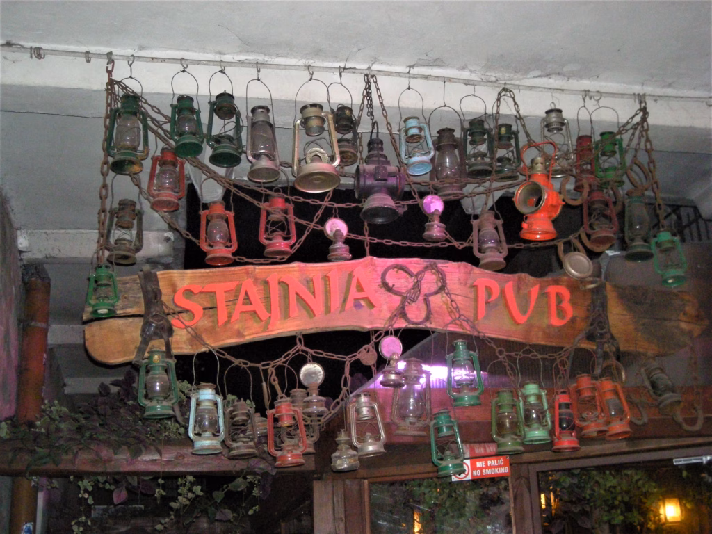 Kafići su dekorisani superzanimljivo. Jedan ima šivaće mašine (stolove sa šivaćim mašinama) umesto stolova, drugi je natakario 100 petrolejki na fasadu, treći je u fazonu alhemičarske radionice (i zove se Alchemia, možda najbolje mesto u gradu za cool pivo, preporučujem Miodne (crno pivo sa medom) i porter Źywiec).