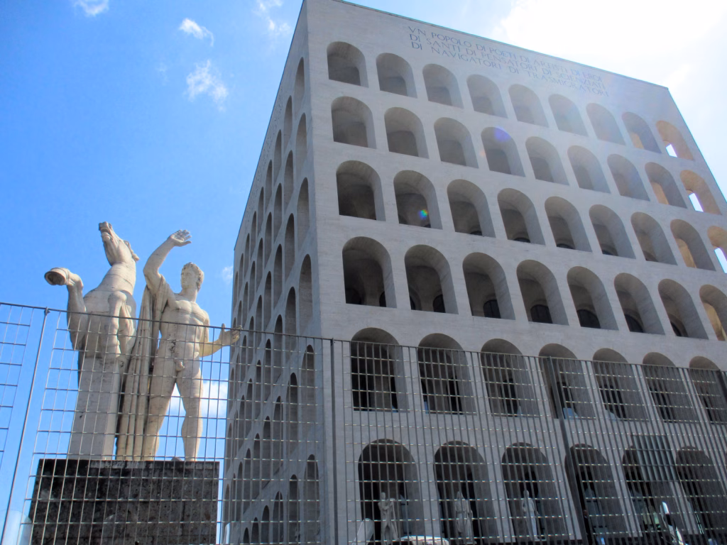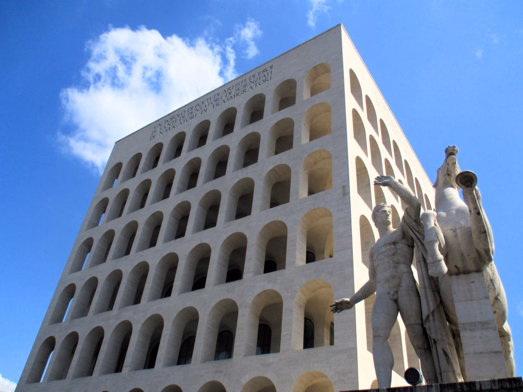 Наиме, међу најимпозантнијим грађевинама налази се чувена Palazzo della Civiltà Italiana, коју Римљани нежно зову „Коцкасти Колосеум“. Прави превод је тешко ухватили, јер је у питању Палата италијанског друштва или цивилизације и културе у целини. Тај монументални блок са низовима лукова – шест по вертикали и девет по хоризонтали – заправо је Мусолинијев иницијал у камену (B-E-N-I-T-O / M-U-S-S-O-L-I-N-I).