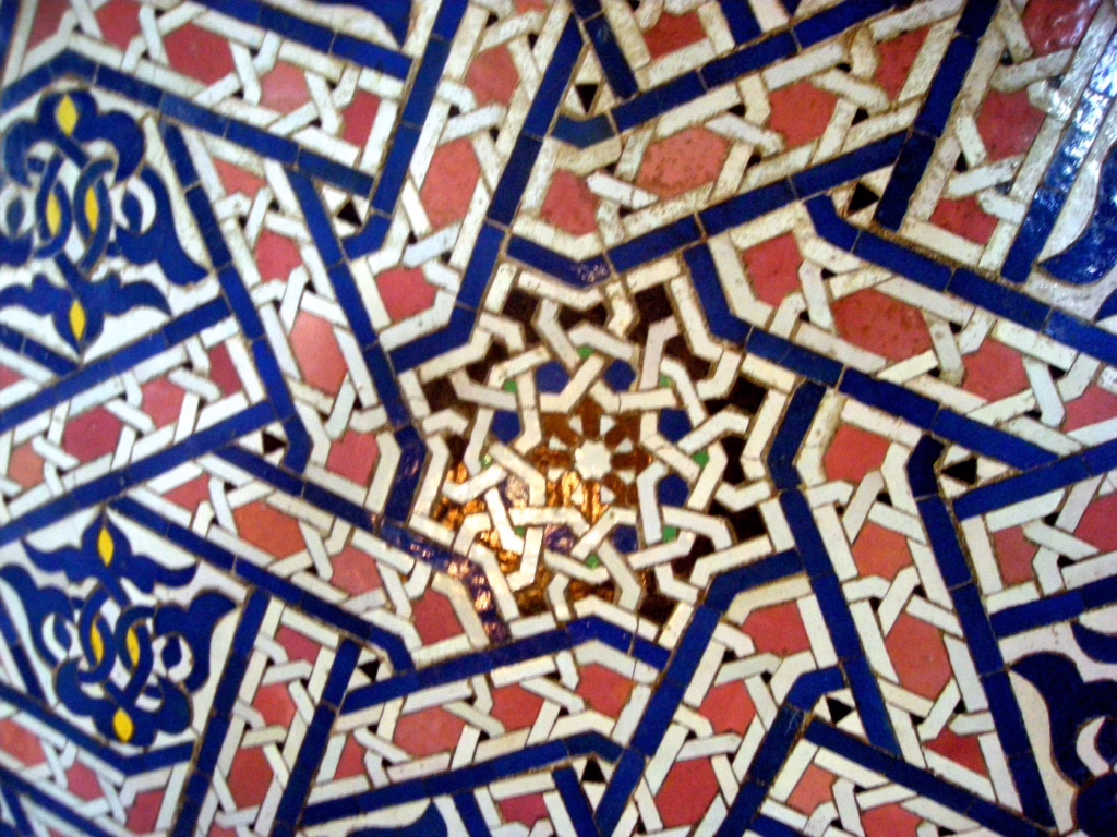 Čipkasti ornamenti u belome kažu nam da je figuracija strogo zabranjena u islamu, da nema druge nego ponavljati stilizovane životinjske i biljne oblike i stilizovati slova.