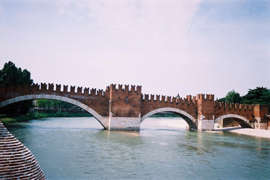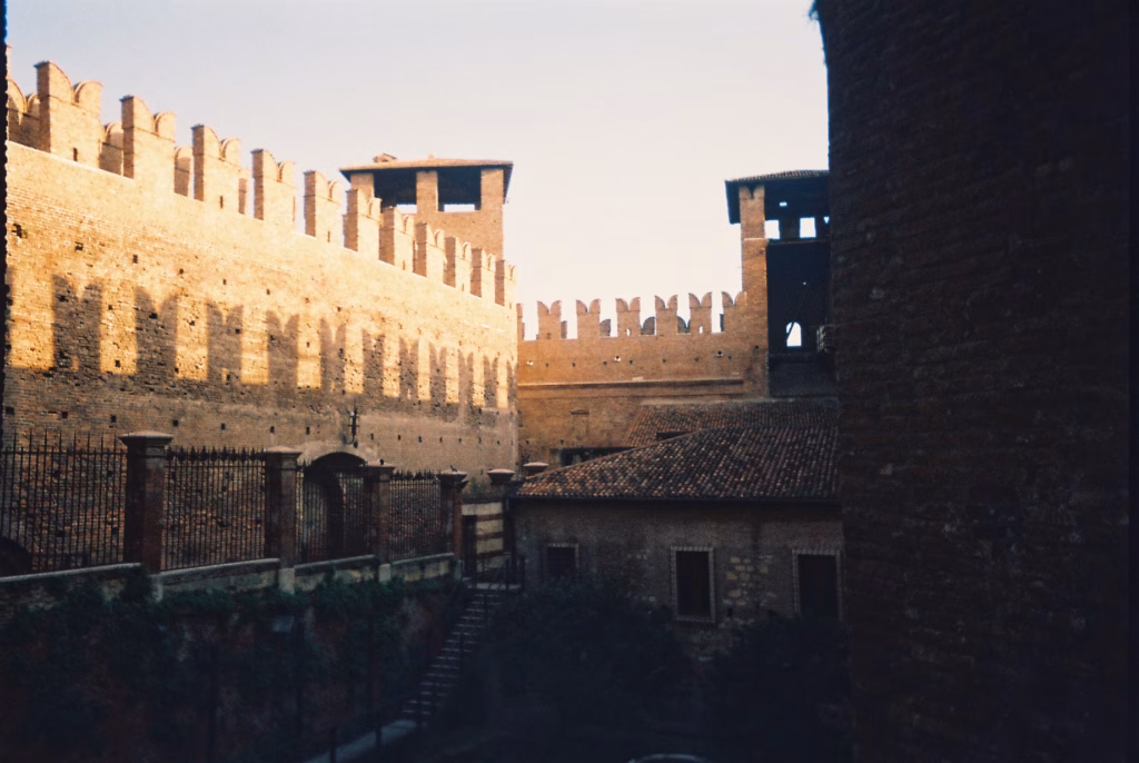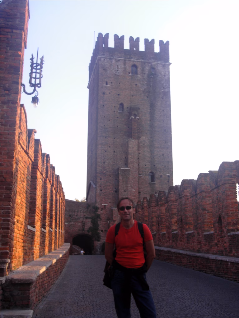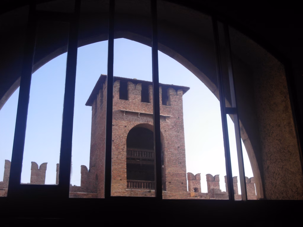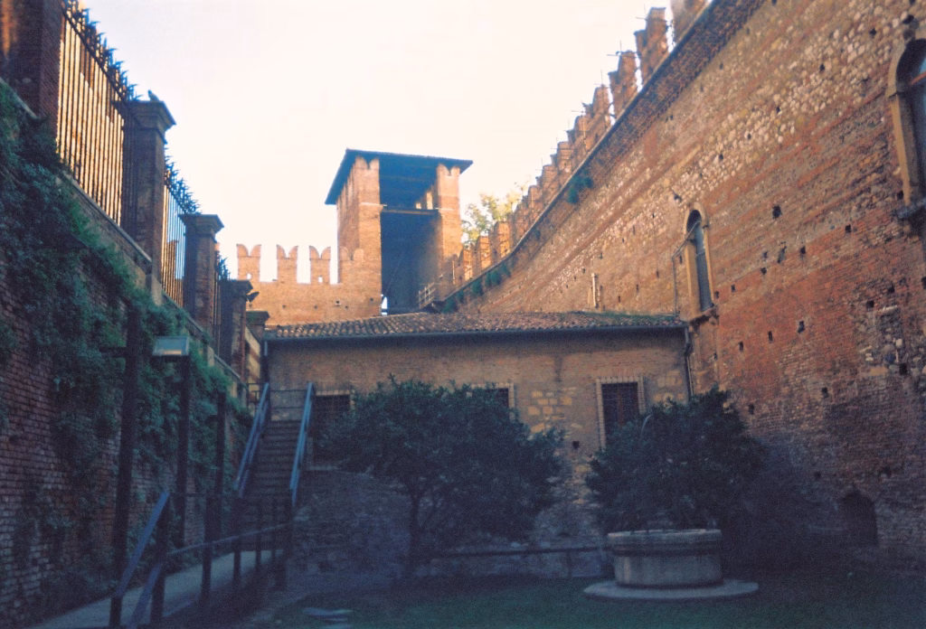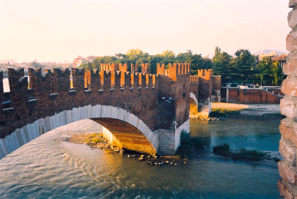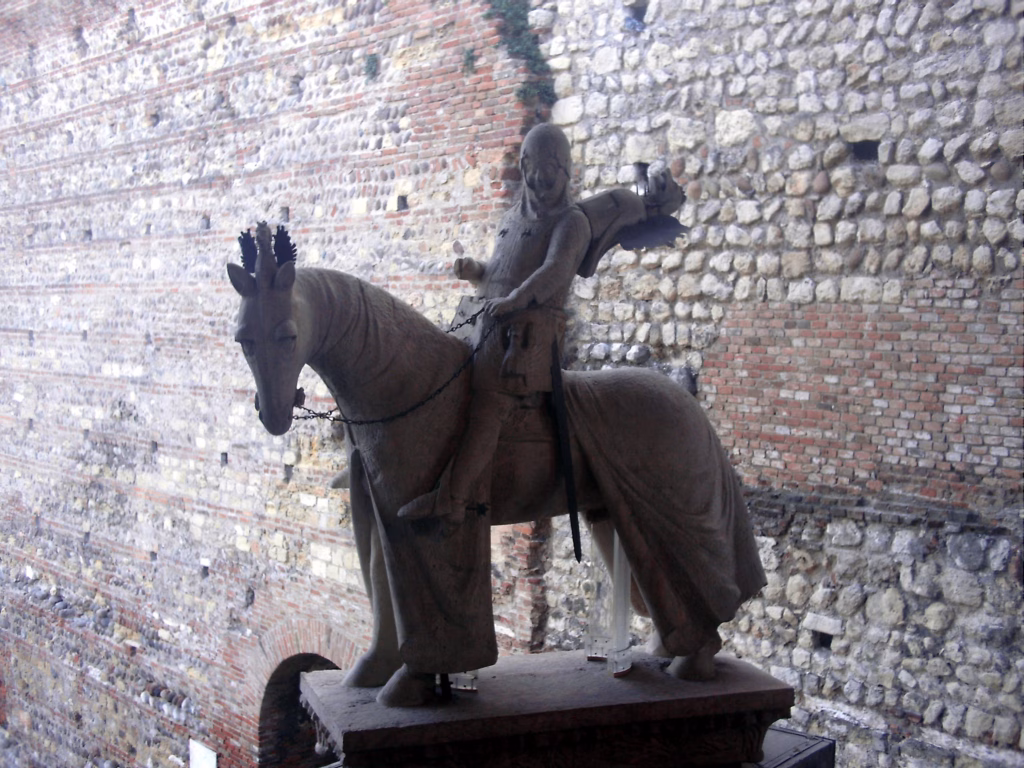Na obali reke Adiđe (Adige), koja izvire tamo negde daleko i visoko, na severu i u Alpima, nakanio se veliki knez Kangrande II iz porodice Skaliger (Cangrande II della Scala), koji je veličinu još pri rođenju uz ime svoje dobio; da postane veliki zauvek, i kao neimar. Naravno, ne ličnim zidarskim trudom (samo je Petar Veliki mogao da lično zasuče rukave, i na holandskim brodogradilištima argatuje zarad vizije Velike Rusije), već graditeljskom vizijom, arhitektonskim rafinmanom i odrešenim kesama zlatnika. Između 1354. i 1356. godine, Kangrande II je, na onoj obali reke na kojoj nisu živeli Romeo i Julija, ali sa koje se pruža odličan pogled na grad, podigao Tvrđavu Svetog Martina (Castelo di San Martino), i ova građevina je, neosporno, dominirala civilnim delom varoši, braneći je i pomno nadgledajući, kao strogo vojničko utvrđenje… Nikla je velika i lepa utvrda, koja je ispočetka imala čisto vojnu namenu, ali, takva je sudbina svih tvrđava-lepotica bila ispočetka; lepotica na kojima sada sede zaljubljeni parovi, crtaju umetnici i pijuckaju kafe u sumrak, od Petrovaradina do Kalemegdana…